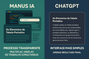 Legenda: Comparação entre o processo transparente da Manus IA e a interface mais simples do ChatGPT